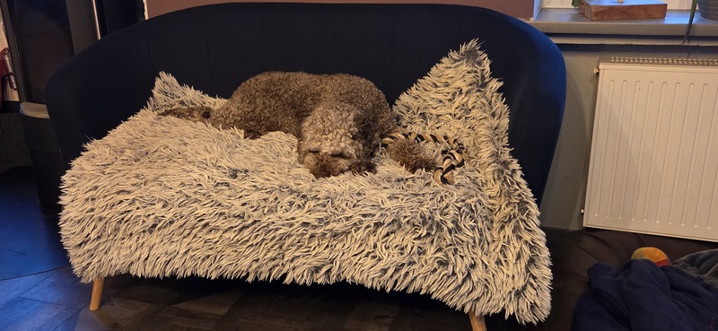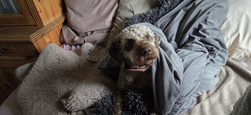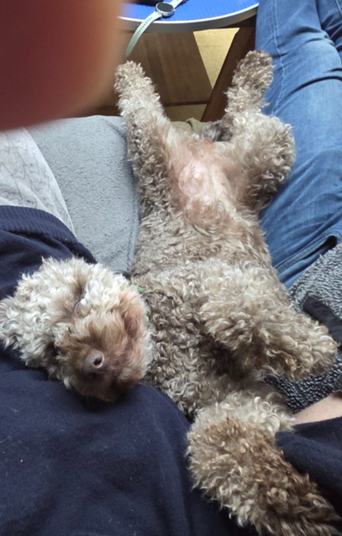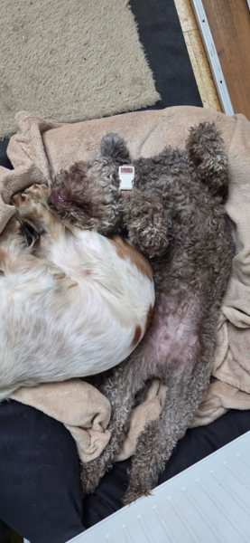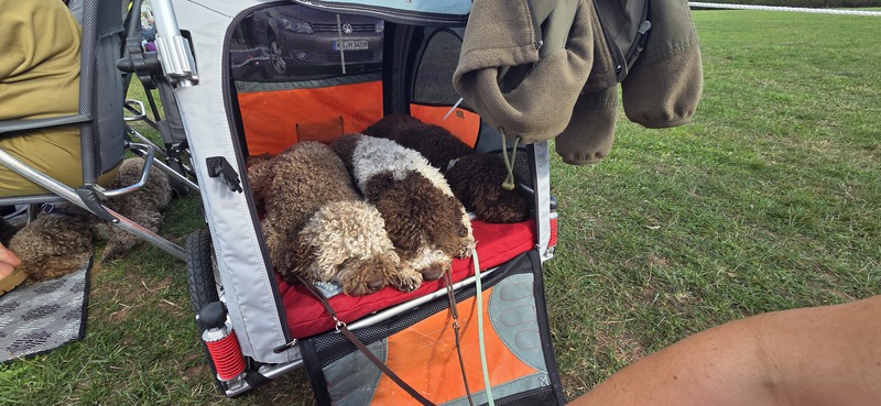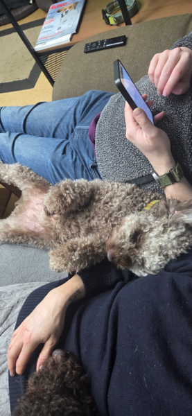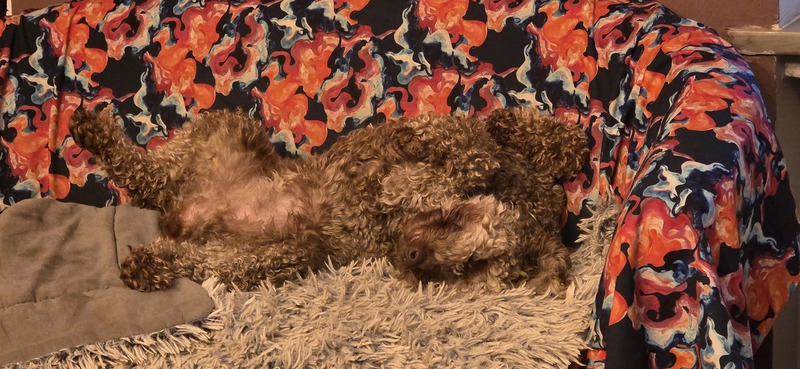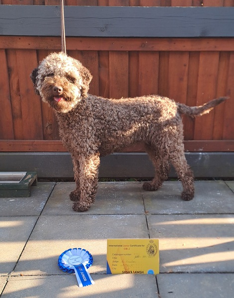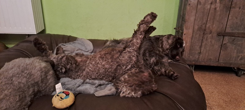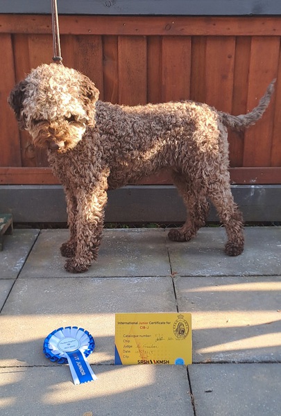 Geboren wurde die kleine dicke Nudel in Schweden. Ein Hund von Bildern und Videos her kaufen ist ähnich einem Auslandstierschutzhund oder einer Katalogbraut. In allen Fällen,weiß man nicht genau was einen erwartet und was man bekommt. Man kann sich nur auf die Aussagen, der Personen verlassen mit denen man das ganze bespricht und abwicket. Manchmal geht das gut oft aber nicht. Für uns war es Dank Pernilla, Silvias Züchterin ein totaler Erfolg. Sie konnte mir damals den kleinen Hund genau so beschreiben, wie sie auch ist. Selbstsicher, unerschrocken, unauffälliger, gerne alleine unterwegs und am rumkrumpeln. Mehr an Lösungen als am Weg interessiert. Trüffelsuchen oder schwierige Aufgaben sind nicht so ganz ihr Ding. Sie wartet lieber, bis der Trüffel serviert wird Silvia ist der klassische Selbstversorger, sie findet selbst Weidekätzchen schmackhaft, hat eine Vorliebe für Armeisen und Rasensonden und erntet gerne auch mal selber Beerenobst oder frisst Weißdornbeeren. Sie ist gerne überall dabei und das am liebsten in den unmöglichsen Schlafpositionen. Ob beim Augenarzt, auf Ausstellungen, oder hier Zuhause, oft wird einfach wie hingegossen gepennt. Natürlch kann sie trotz allem den altbekannten pöbelden Lagotto raushängen lassen und ist mit Stimme und der Cockerverstärkung im Haus manchmal nicht zu überhören. Bis jetzt hat sie ab und zu mal mit den Nachwuchs erzogen aber eigentlich hat die den Welpenzwegen ehr beigebracht was fressbar ist, wo man buddeln muss oder wie gepennt wird.